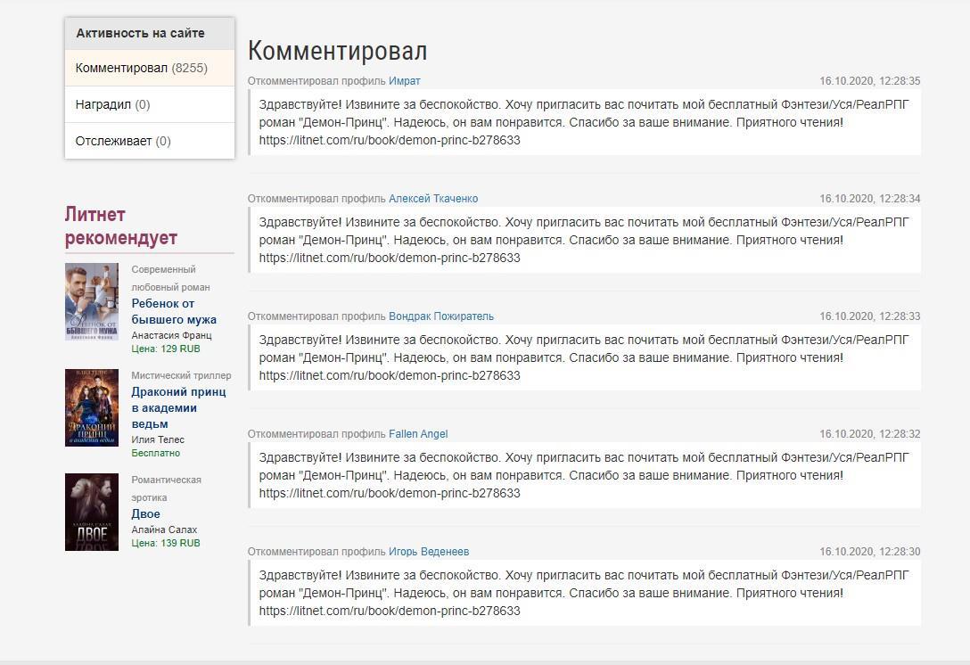 Автор: ArgozavrЗдравствуйте. Случайно наткнулся на комент-предложение "Здравствуйте! Извините за беспокойство. Хочу пригласить вас почитать мой бесплатный Фэнтези/Уся/РеалРПГ роман "Демон-Принц". Надеюсь, он вам понравится. Спасибо за ваше внимание. Приятного чтения!". Пошел посмотреть кто это и немного потерялся от рекламной компании автора.