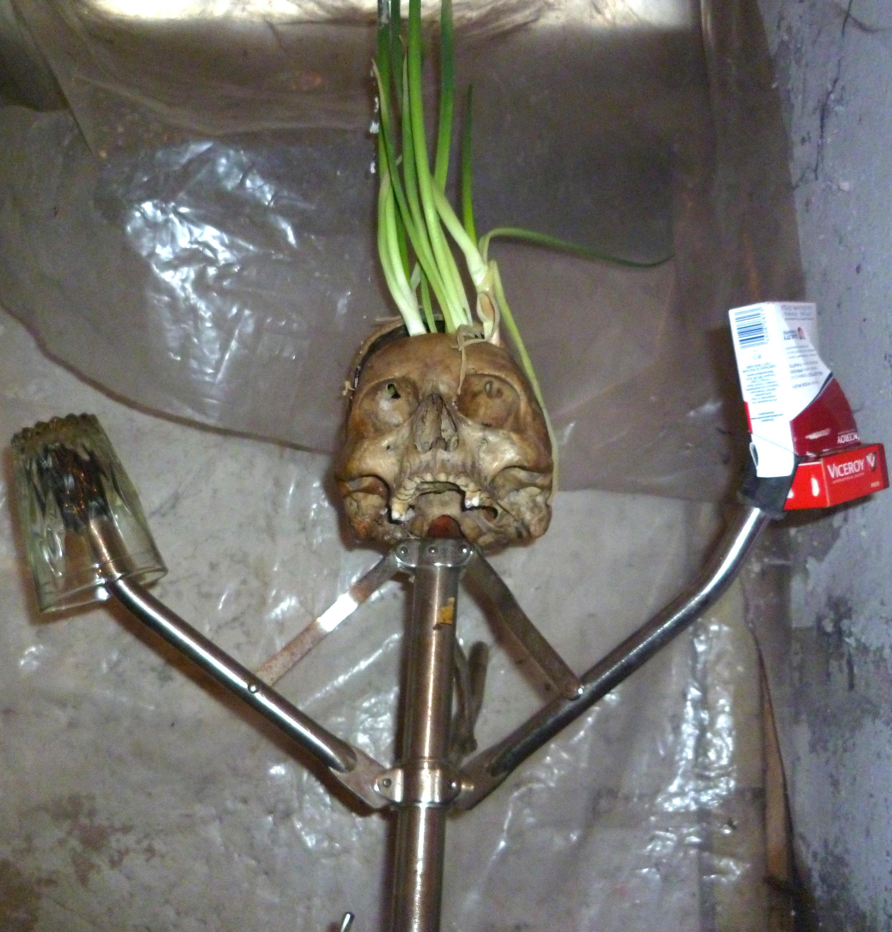 Нужны, наверное, какие-то пояснения... Я не знаю откуда в нашем подвале взялся Камрад Йорик. Кажется, он жил там до нас. На фото, которое я хотел сделать обложкой нашего первого альбома, Камрад Йорик отражал почти все наши подростковые панковские реалии. И, кстати, ирокез, так шикарно торчащий из его макушки - это лук, хрен знает как, каким чудом там проросший...