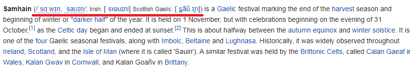 Кстати, только сегодня мне рассказали, что Самайн, т.е. Samhain, на самом деле произносится как Сэввин. Потому что в гэльском варианте сочетание -mh- читается как -vv-. Вот такая занимательна фонетика. Я полезла проверять и вот, что нашла.