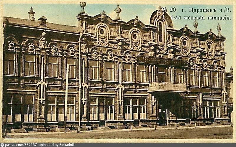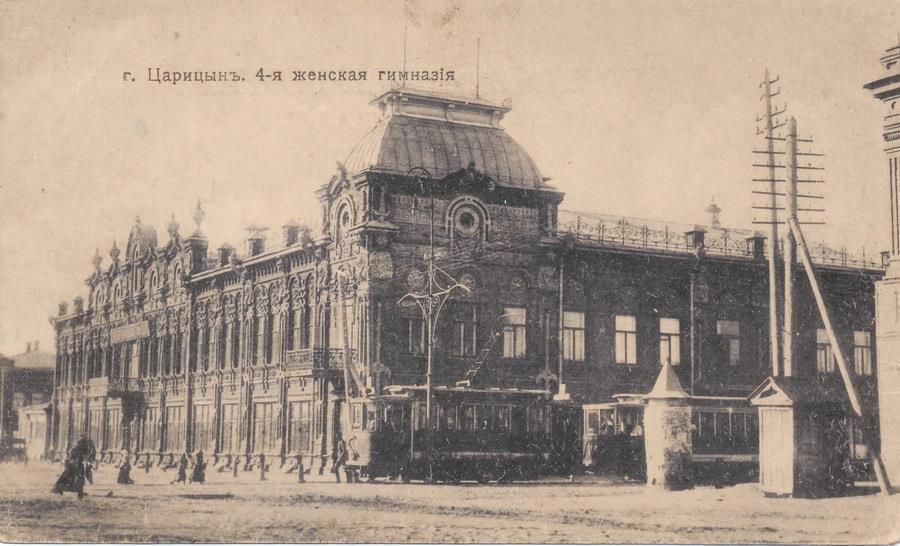 Откуда такая точность? Дело в том, что здание было построено меценатом-купцом "для общественных нужд", а женская гимназия (4-я в Царицыне и первая в Зацарицынском форштадте - ныне Ворошиловском районе) была открыта в нём только в 1910 году - спустя 28 (!) лет после постройки здания. Что было в нём до этого? Какие "общественные нужды"? Мне, увы, неизвестно. Почему фото не более позднее? Дело в том, что уже в 1913 году гимназии стало тесно, к тому же к ней добавилась начальная школа для девочек, и здание было расширено - стало Г-образным с большой угловой башней и пристройкой по перпендикулярной улице Княгининской (ныне Рабоче-Крестьянской). Да-да, представьте себе (кто знает Город), что трамвай ходил по Рабоче-Крестьянской вплоть до 1964 года - открытия нового моста через Царицу, создания Первой Продольной путём объединения Рабоче-Крестьянской с проспектом Ленина и пуска ныне уже не существующего троллейбусного маршрута №2 (но это уже, как говорит Леонид Каневский, совсем другая история):