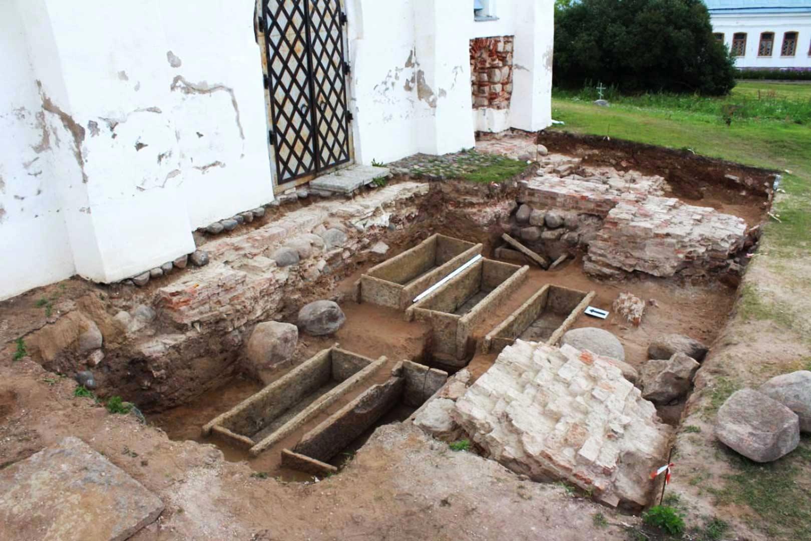 Ну, и ещё один интересный штрих. Назовём его «делом о каменных саркофагах». Начали, это значит, копать археологи в Юрьевом монастыре, да и наткнулись нежданно-негаданно на шесть каменных саркофагов 12-13 веков. В таких хоронили «лучших людей» и в других городах Руси. А вот и само это место на фотографии: