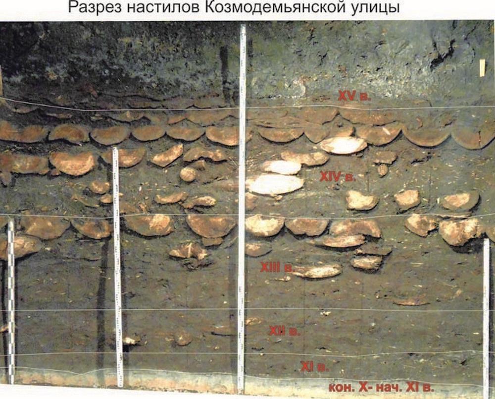 Вот такое носили русские модницы в период с 10 по примерно 14 век. Не слабо так, да? Замечу, что в такой обуви по грязи шлёпать не получится. Это обувь для ровной чистой поверхности… мощёной поверхности. И такая поверхность в Новгороде была видимо практически везде. Да – речь идёт о деревянной мостовой Великого Новгорода. Вот эта мостовая на срезе земли в раскопе: