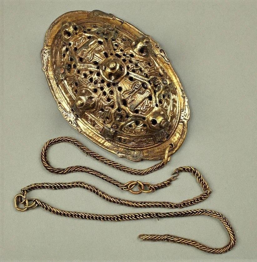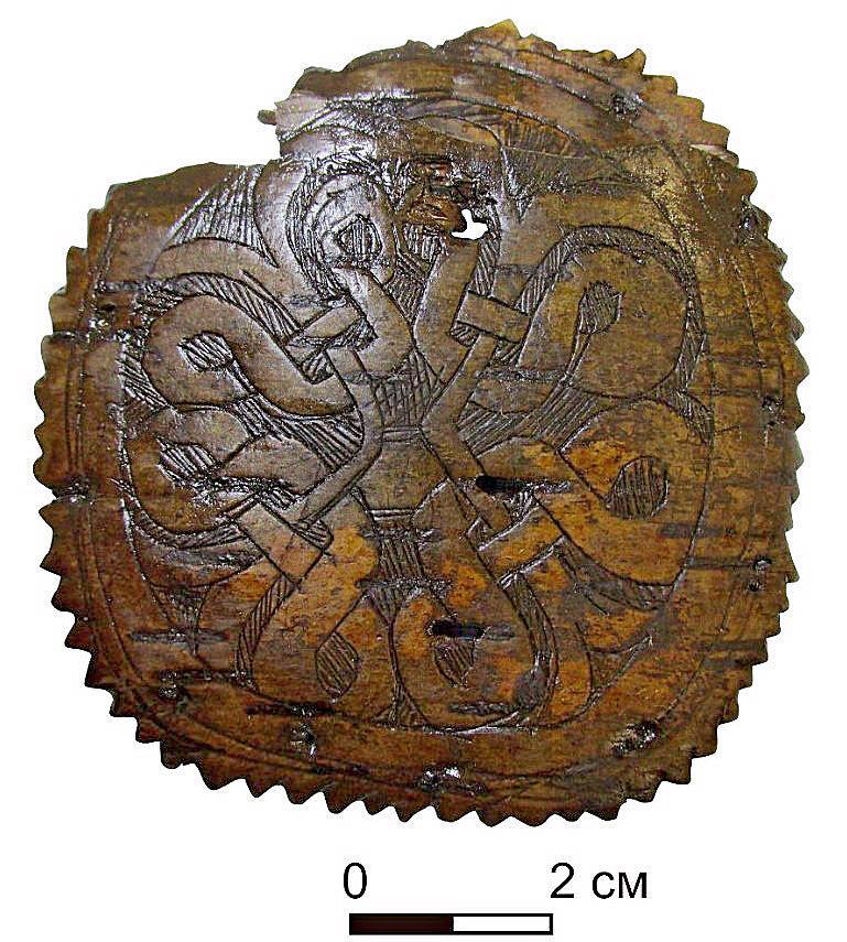 Хочу заметить, что такие же украшения делали не только из металлов. Вот что-то типа медальона, который точно куда-то пришивался, но сделанный из дерева: