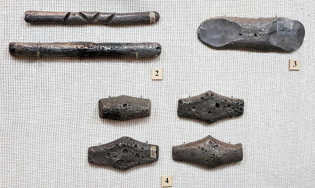 Если кто не понял, что это такое, то поясню – это обломок деревянной детской лошадки на колёсиках. Детишек очень любили и тогда. Делали для них высокотехнологичные игрушки. Ведь колёсики означают наличие стальных осей. Дорого, однако. А это значит, что жили весьма сытно и зажиточно. И это как минимум с 10 века по 14 век включительно. Водились деньжата у людей и немалые. И ещё замечу, что деньжата весьма разные. В смысле по происхождению разные. Денежная система была очень сложной и запутанной, а это означает, что какого-то особого единства во власти в нашей стране всё же не наблюдалось, хотя вроде бы все входили в «Золотую орду». Вот слитки серебра под названием «гривны», которые были в ходу в качестве платёжного средства: