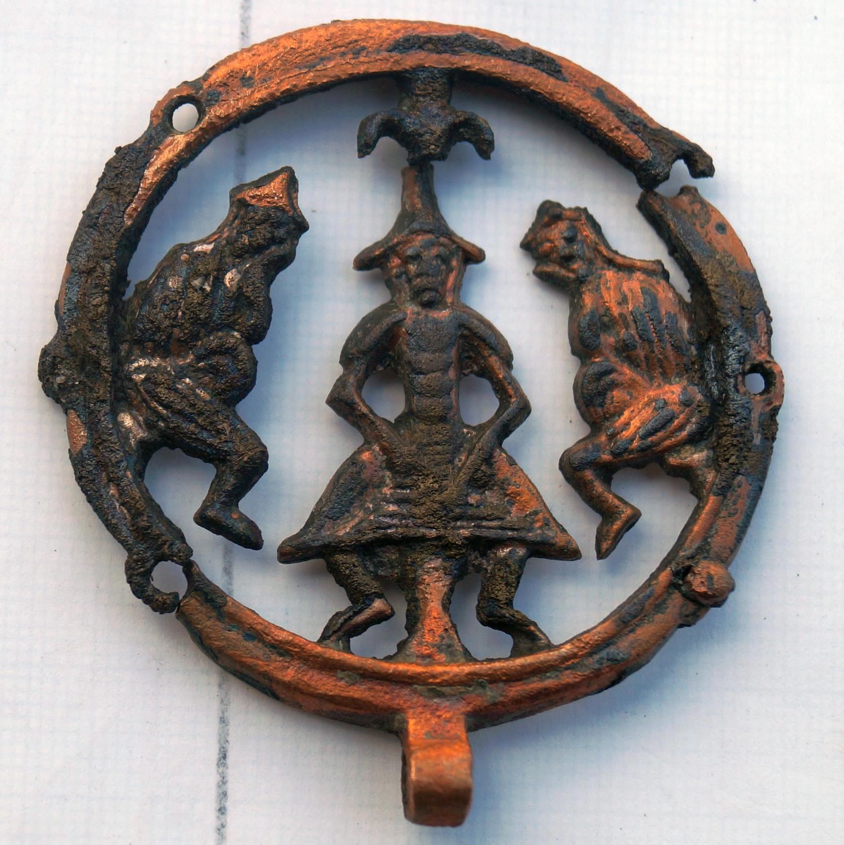 Итак, многофигурная композиция, на которой мы видим одного человека с гуслями и двух слушателей. Точно, что не подвеска – ушко внизу. Это к нему что-то подвешивали. А сама штуковина была к чему-то пришита. Очень интересно. И не я один на неё обратил внимание. Сейчас почти точные копии этой ювелирки можно купить у ювелиров. Может даже не для того, чтобы носить, а для того, чтобы смотреть на неё, придумывать варианты её использования и думать о скоротечности жизни.