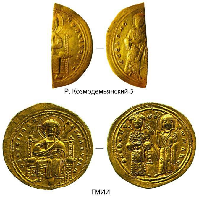 Слитки были местные – это образец №2. Были и чужие. В качестве примера здесь есть слиток из Чернигова под №3 и из Киева под №4. Были и «рубли», как куски от гривен. Совсем недавно выяснили с помощью записок на бересте, что «золотник» был не только мерой веса, но и денежной единицей. Кстати, золото тоже было в ходу. Археологи со справедливой гордостью похвалились тем, что нашли там половинку золотой монеты. Вот она и её целый вариант для сравнения: