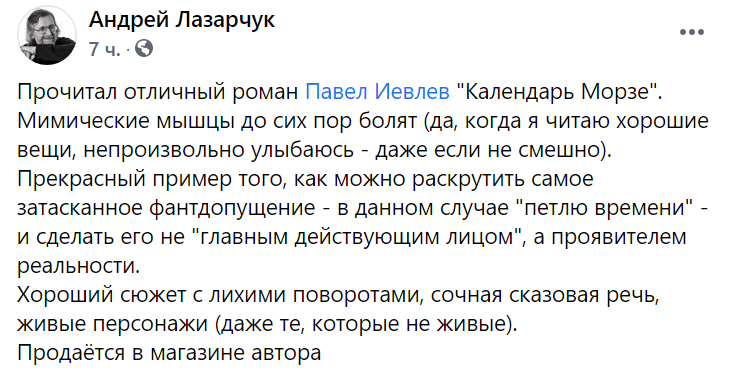 Для меня его оценка значит больше, чем попадание того же «Календаря Морзе» в шорт-лист «Новых горизонтов». И даже если роман, паче чаяния, возьмет премию, все равно гордиться я буду не этим, а рецензией Лазарчука.