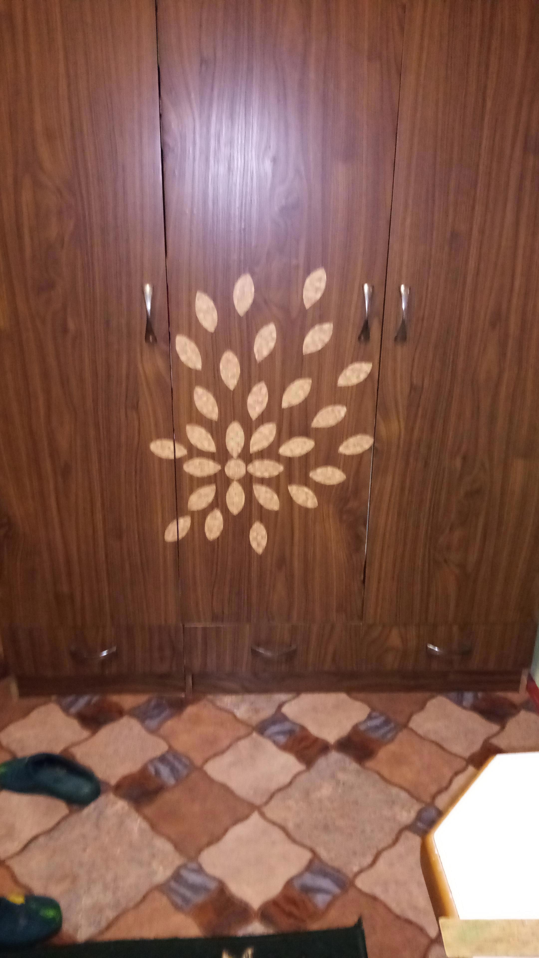 На этот раз я взяла вместо краски плёнку самоклейку. Это самый разгар процесса, дверки я уже заклеила, теперь просто леплю листочки. Но не забываю время от времени ходить на кухню и тыкать в айву ножом.