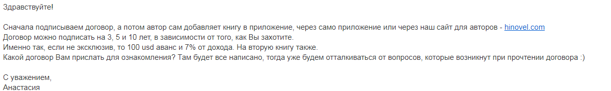 Грубо говоря, получается, что автор сам регистрируется, получает договор. Подписывает на 3, 5, 10 лет. Сам грузит книгу. Если не эксклюзив, то вот вам 100 $ и 7% от продаж. Если без аванса, то 9%. Все.