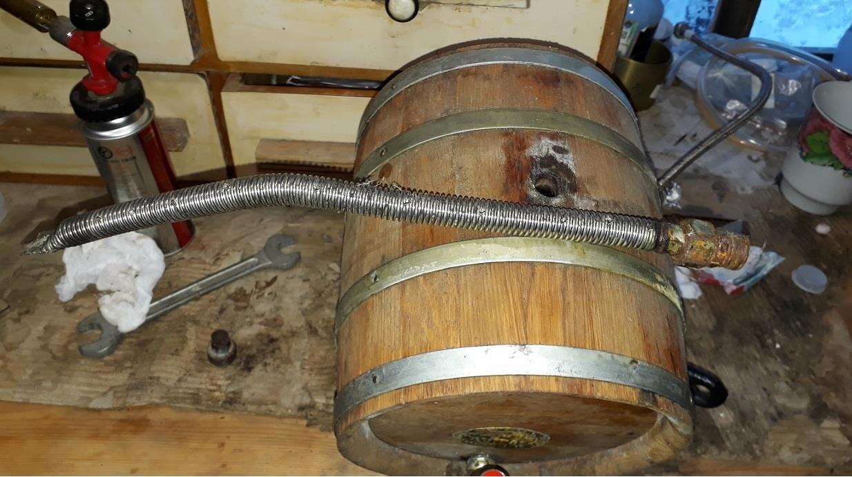 А вот мой личный отработавший свое барботер (бульбулятор) это он находился в перегонном кубе и через него пар грел агрессивную брагу, через него пробулькивался пар, да так что штуцер разъело. (бочка случайно попала в кадр)
