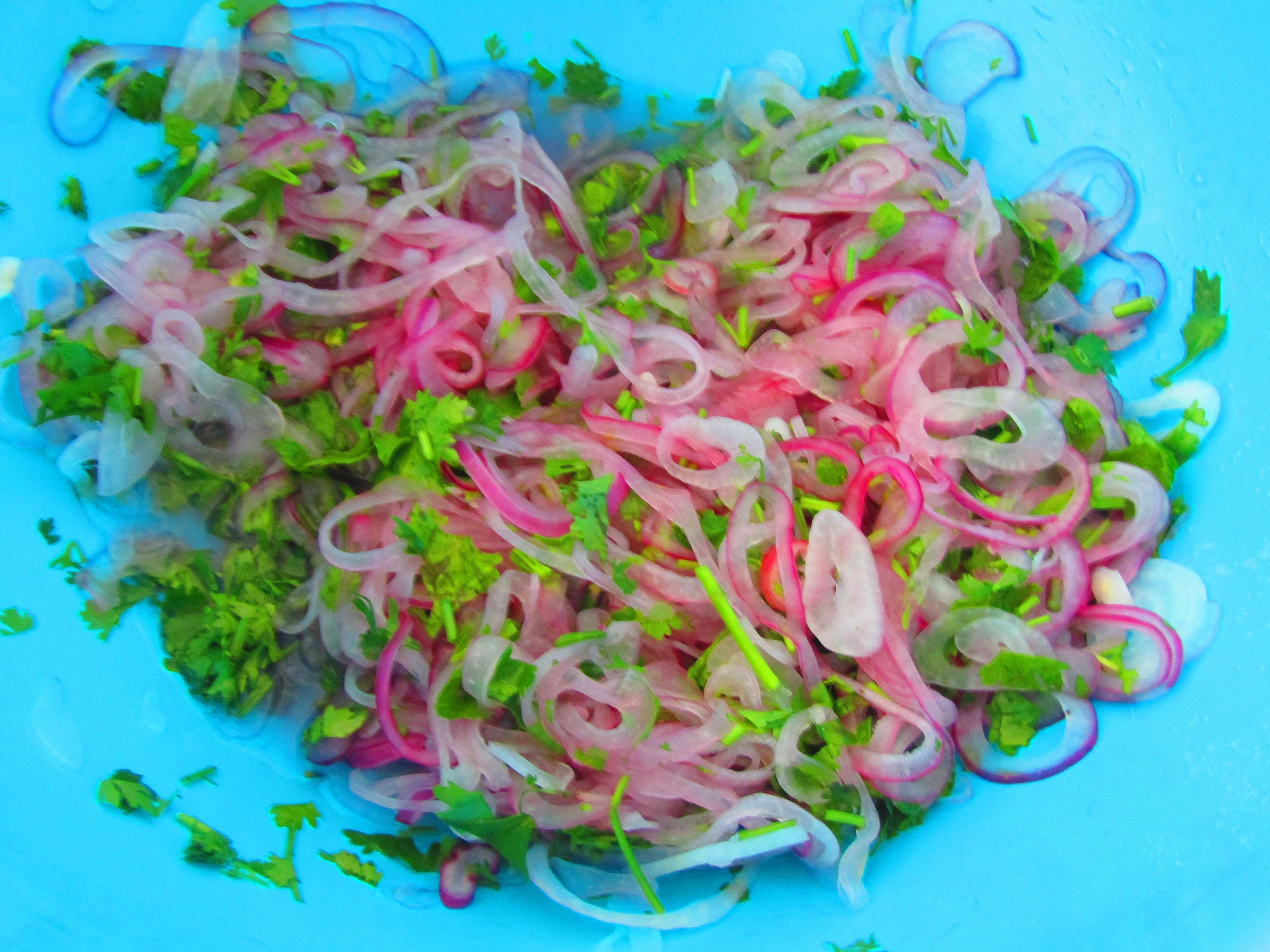 Позвольте представить вашему вниманию... лук. Нарезанный кольцами, сбрызнутый соком лимона и посыпанный солью. Время приготовления - 15 минут. Хорош как сам по себе, так и в связке с чем угодно. Добавить зелени и с картошечкой - ням-ням. В энсебойядо так вообще отлично.