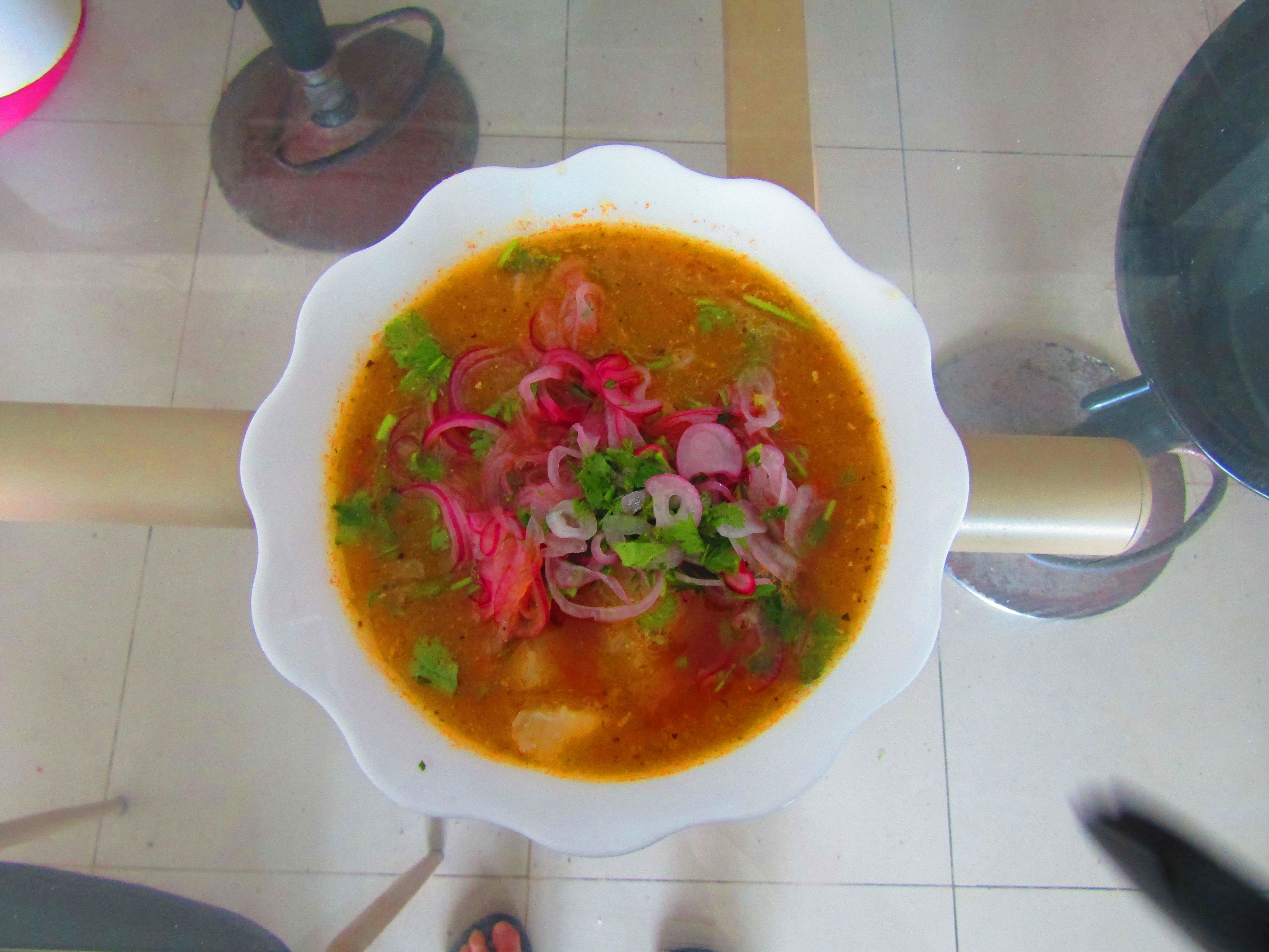 А теперь самое интересное. Вот за что люблю эквадорскую кухню - никаких заморочек. Сначала в отдельной миске маринуем лук, для него оставим немного зелени. Оставшееся, никак не нарезая (!), сваливаем в кастрюлю и варим до готовности юки (15 минут, тунцу дольше не надо). После вылавливаем рыбу и юку (картошку). Первую сразу отправляем в тарелки. Половину юки (картошки) режем кубиком и отправляем туда же, а вот вторую - в блендер. Туда же сваливаем остальные овощи с половиной бульона (вторая - на плите) и перемалываем в пюре. Соединяем пюре с бульоном, доводим до кипения, разливаем по тарелкам. Сверху добавляется маринованный лук с зеленью.