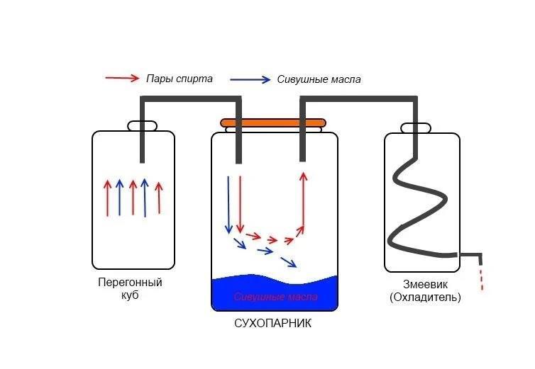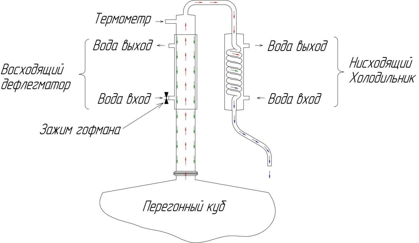 Первое – дефлегматор. Обычно вертикальная труба с охлаждением. Вот схема.