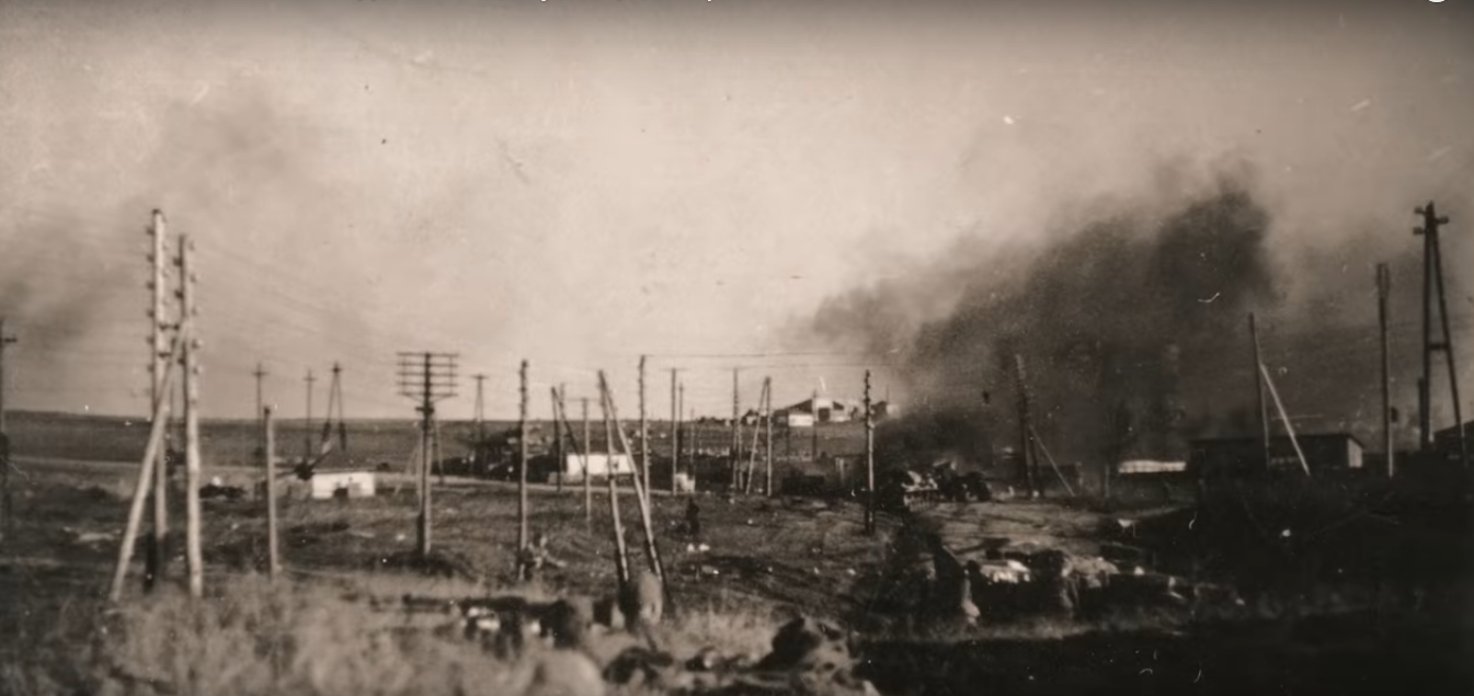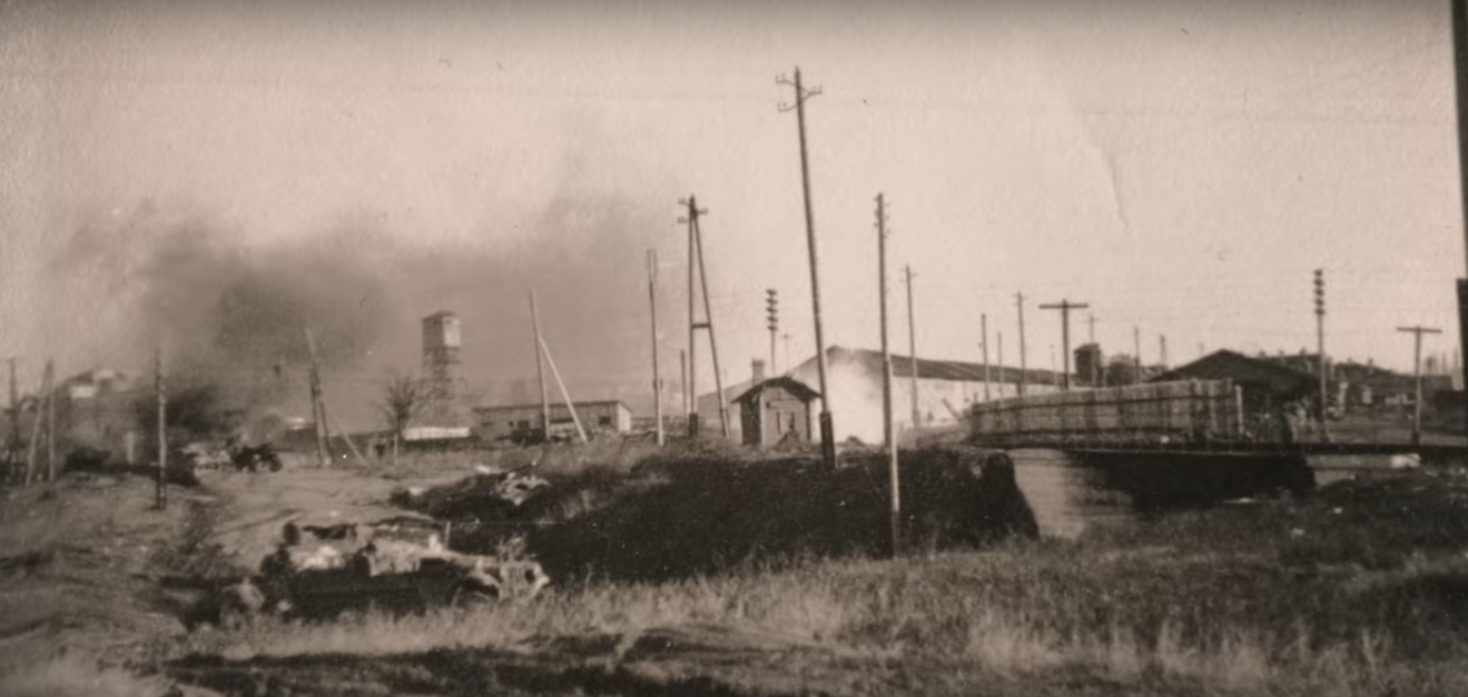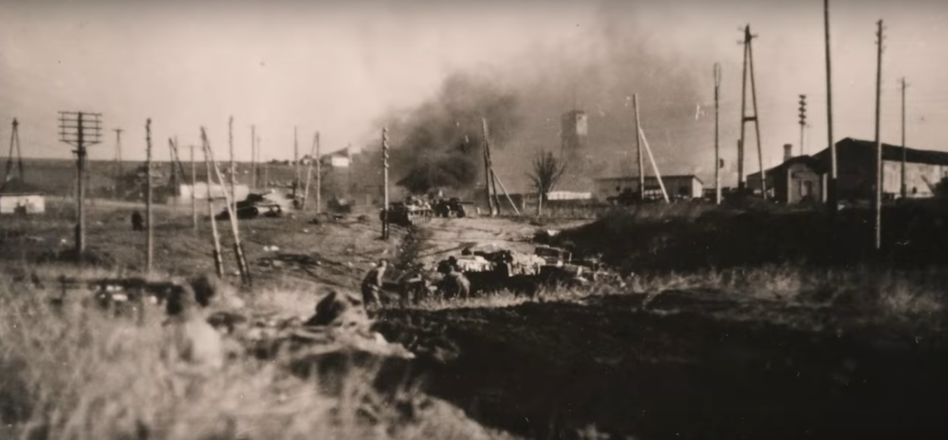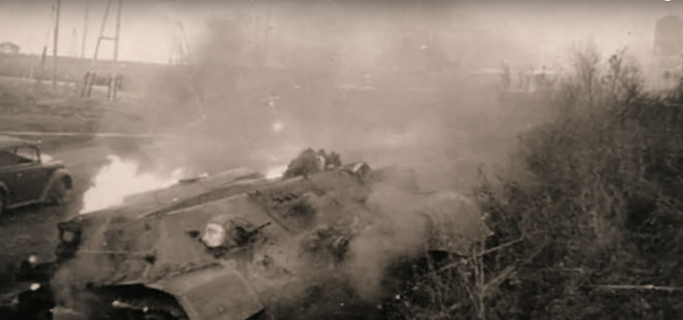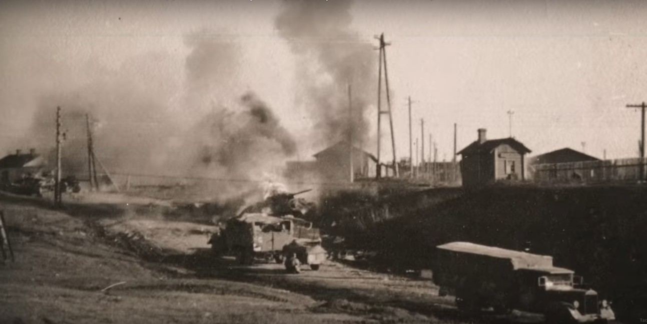 6. «Тридцатьчётверка» горит. Скорее всего, она пыталась таранить стоящие на дороге немецкие машины. Видно, как за ними прячется немец
