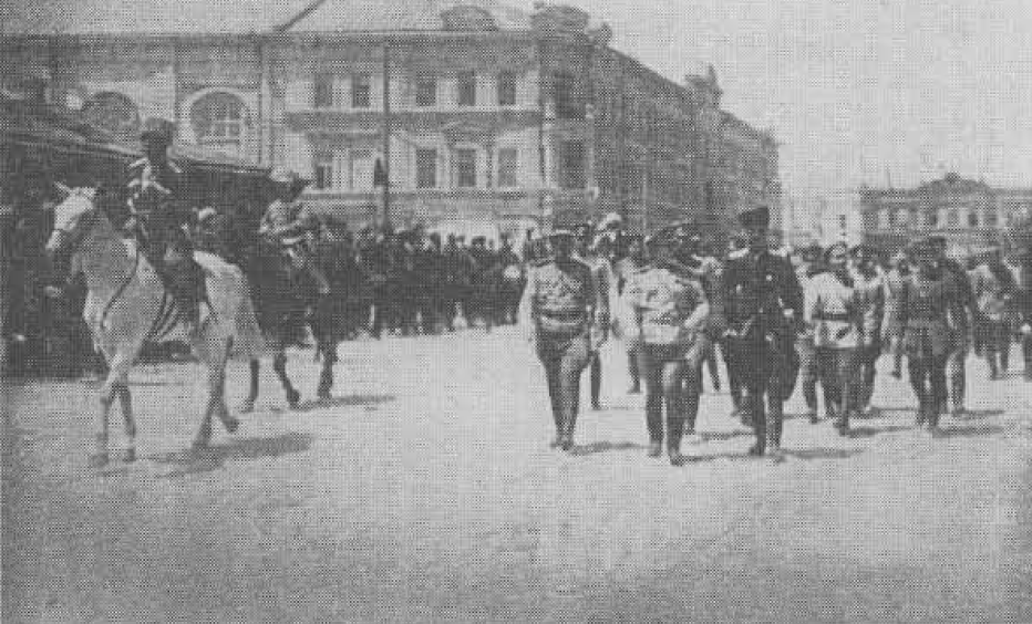 А вот и их противники - Деникин (с бородкой) и Врангель (как обычно, во всём черном) во главе своих войск проходят мимо "Столичных номеров" (слева) в 1919 году: