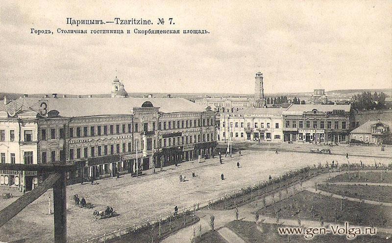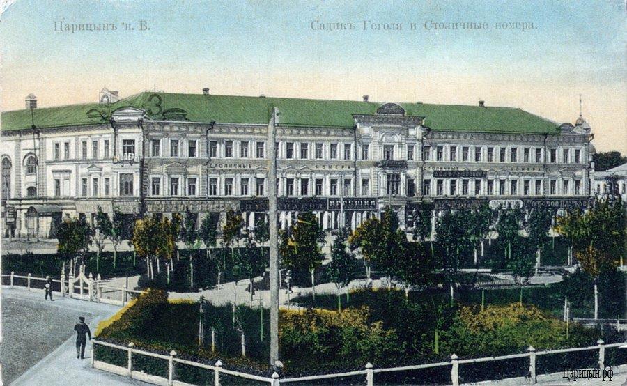 Гостиницу "Столичные номера", начиная с 1880 года строил один из крупнейших купцов Царицына - Воронин (тот самый, что выкупил сгоревший Дом Божескова). Строил в несколько этапов: первоначально гостиница представляла собой простое прямоугольное здание, обращённое фасадом на Городскую площадь. Затем были построены два крыла, тянувшиеся вдоль улицы Пушкинской (ныне улицы Пушкина) и Ломоносовской (ставшей в 1950 году частью улицы Мира), а ещё позже - четвёртая часть вдоль улицы Спасской (ныне улицы Володарского), замкнувшая гостиницу в форму прямоугольника. Кроме собственно гостиницы, как видно из фотографий, там располагались и ресторан, и магазины. Известно так же, что именно в ней работали купеческая биржа и театр "Буфф".