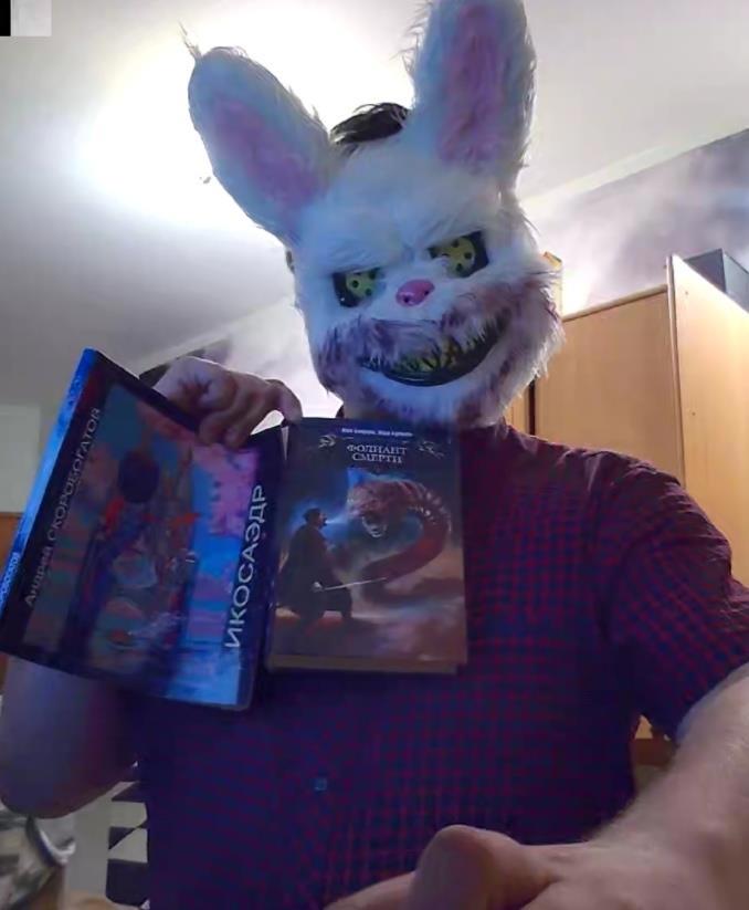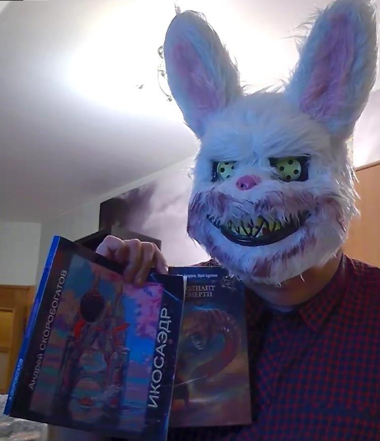 К слову, Заяц Кирк держит в руках сборник моих рассказов "Икосаэдр" и роман Олега Бондарева и Юрия Бурносова "Фолиант Смерти"