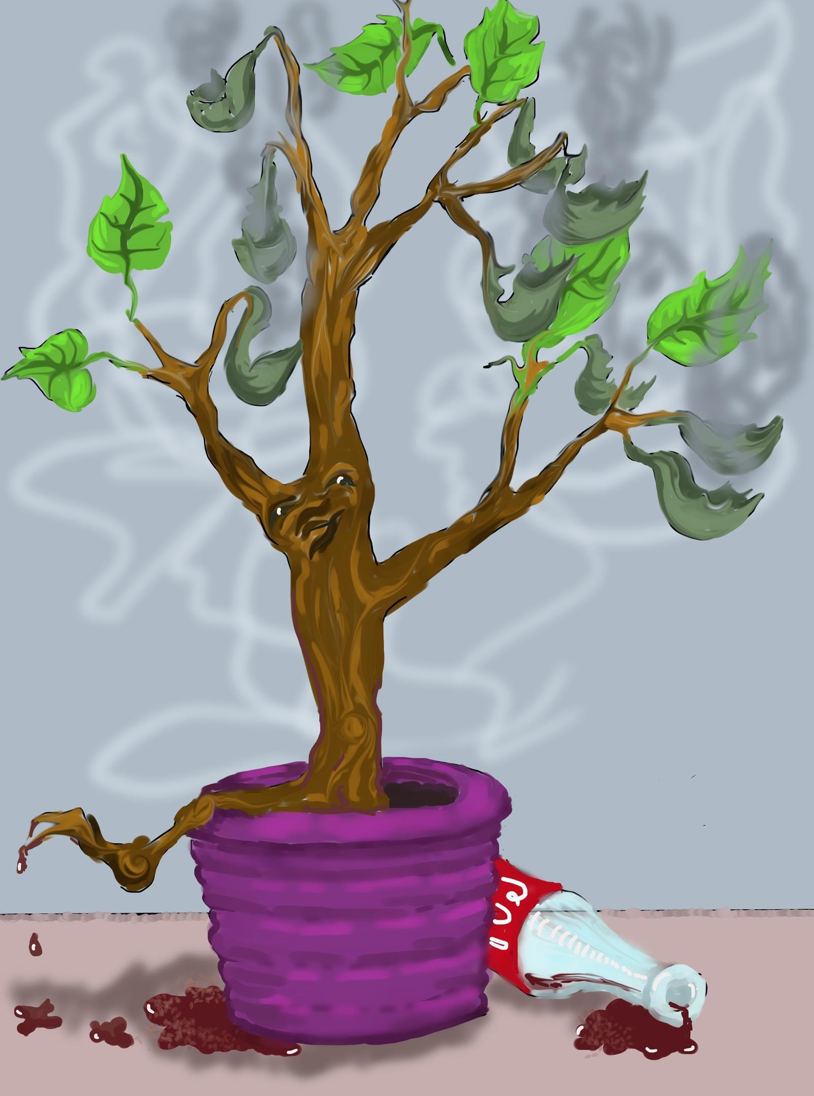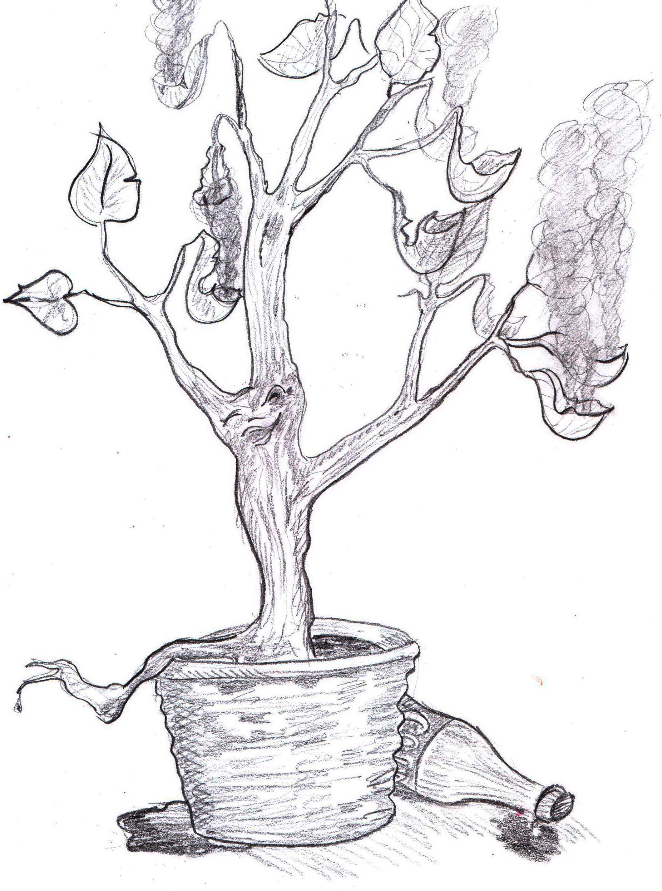 — Все листья у него тут же свернулись в трубочки! Курительные. Представляете, бабуля приходит, а Чарик стоит дово-ольный, вместо листьев трубочки, и они ими всеми курит… Что тут было! Бабуля за мной полчаса гонялась с зонтиком. «Я тебе покажу, как моего Чарика спаивать колой и учить курить!» А я и не учил, он сам умеет. Стоит, курит, все в дыму, аж соседи стали звонить в «ноль-один».
