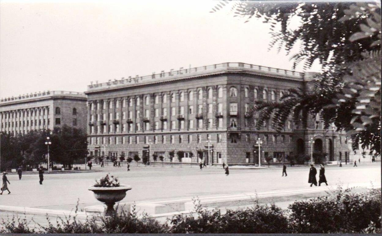 Что между этими двумя зданиями? Улица Пушкина (бывшая Пушкинская). Немного позже, в шестидесятых, она будет перекрыта дополнительным корпусом Мединститута с аркой, которые хорошо видны на фото уже семидесятых: