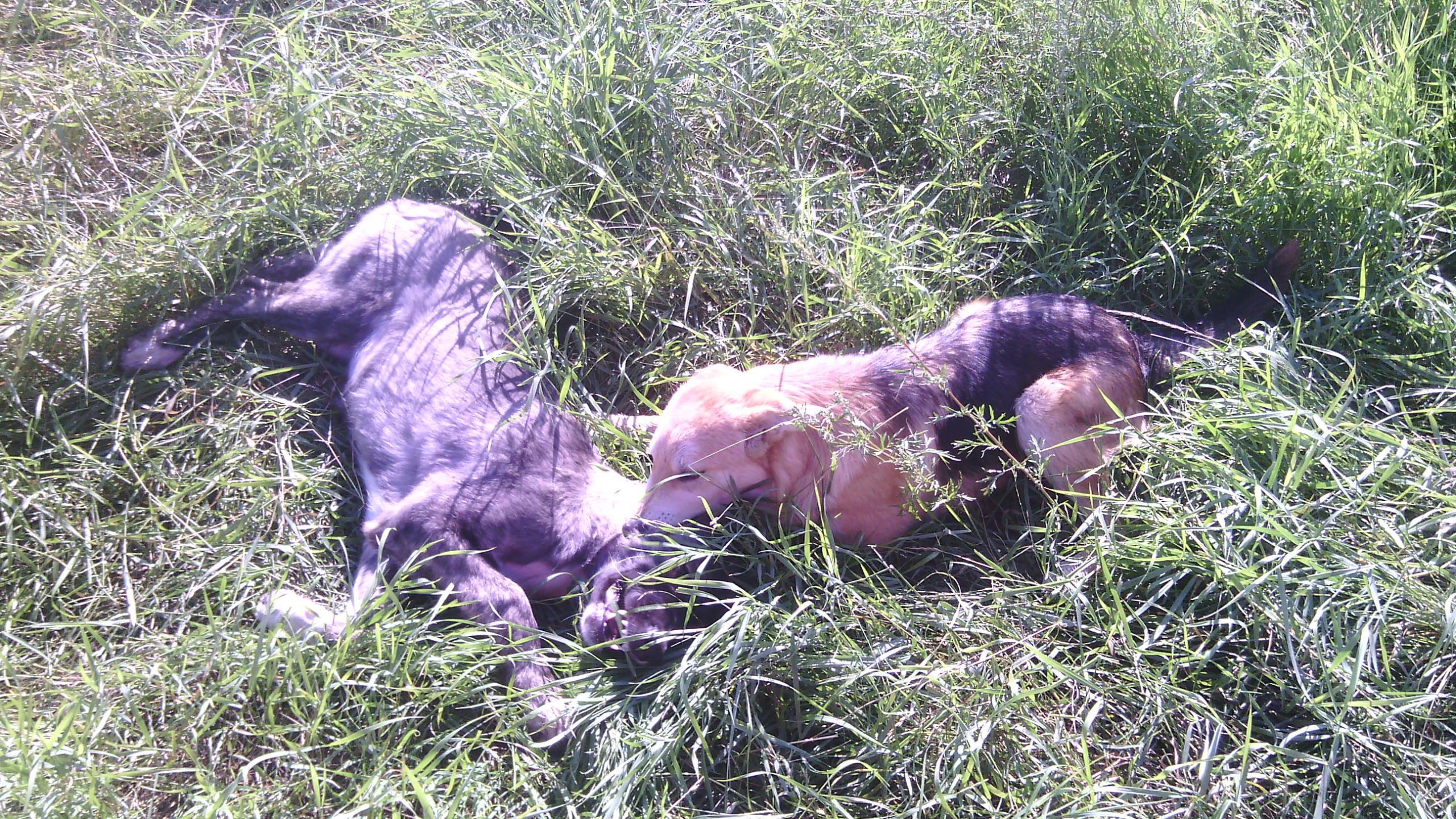 А эти собачки аж прошлогодние (если не более ранние). У меня с ними несколько фоток, но выложу эту. Фотка не то, чтобы самая лучшая, но хорошо показывает близость этих пёсиков. Они, кстати, часто бегали вместе (друг за другом).