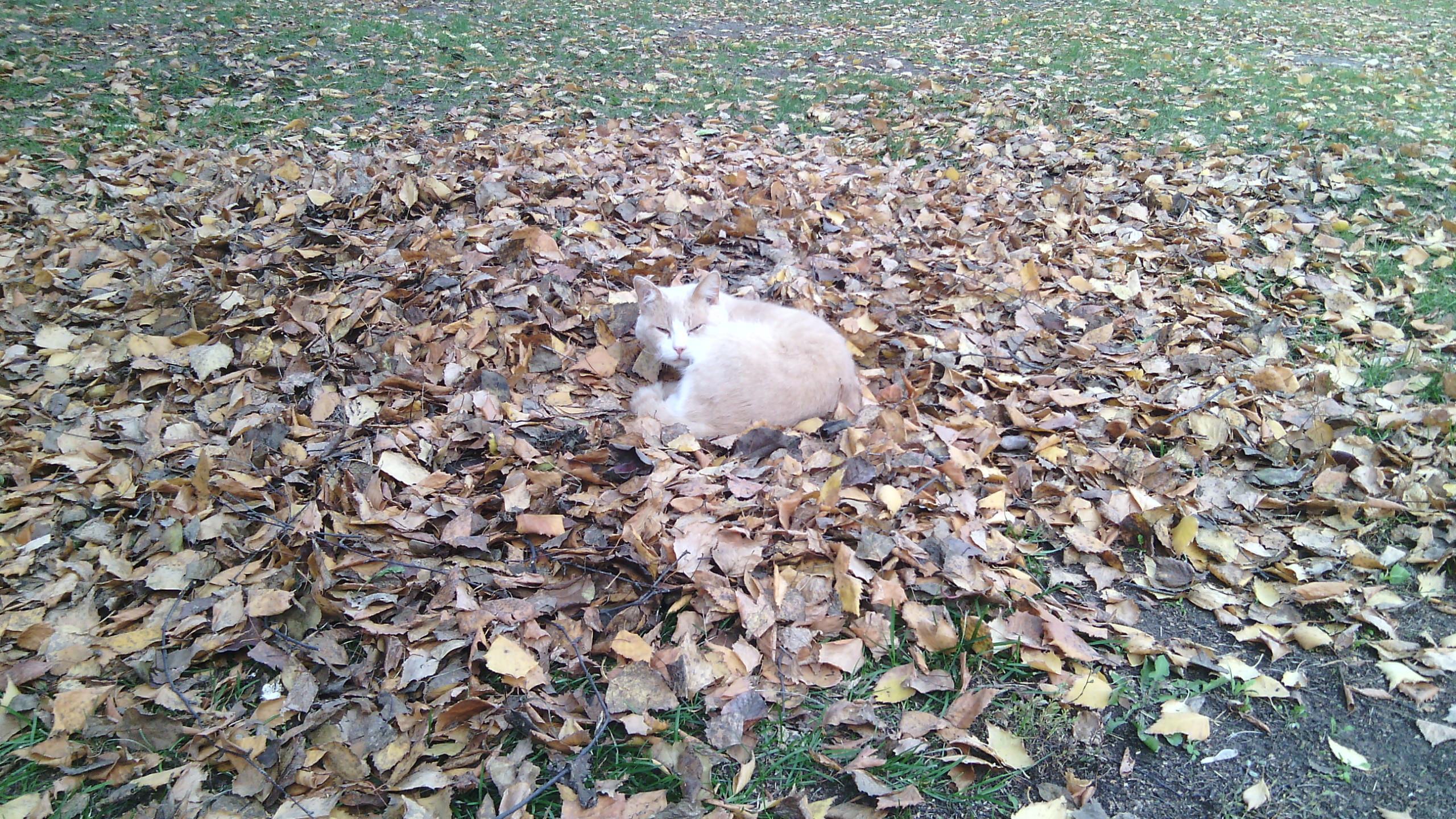 Сперва котик/кошечка. Прихожу я, значит, на работу, а там такое чудо. Лежит себе на листьях, дрыхнет. Я, конечно, немного прифигел, однако виду не подал. Достал фотик и давай щёлкать. Кстати, чудо потом ещё долго дрыхло на этих самых листьях, пока кучу не убрали окончательно. Как вам? Очаровательно, не правда ли?