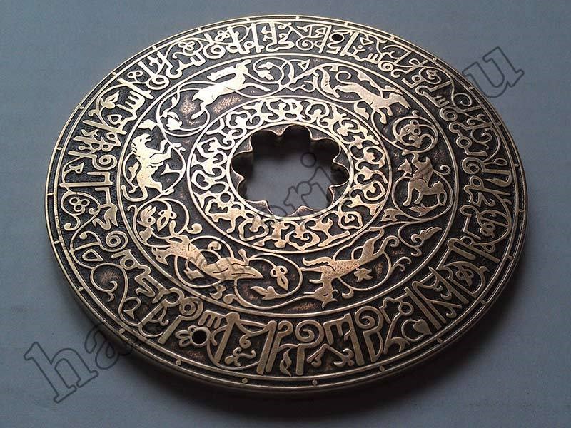 Дальше начинается творческая энергия исследовательских масс... ну или масс исследователей. Это как кому больше нравится. Ну что ж, давайте рассмотрим это изделие повнимательнее. Мне приходилось работать с металлами, поэтому уверенно говорить о технологии изготовления не возьмусь. То есть здесь возможны варианты. Наиболее вероятных варианта два. Первый – литьё. Однако это больше свойственно изделиям «серийным», поэтому более предпочтительным является второй вариант – чеканка. Далее… в центре имеется отверстие в форме восьмилучевой звезды с округлыми лучами. Может форма связана с необходимостью жёстко закрепить диск на оси, чтобы не крутился, но может быть сквозь эту дырочку какой-то свет должен был проникать. Далее имеется три одинаково непонятных кольца. Внутреннее кольцо вроде бы похоже на травный узор, однако слишком необычный. То есть узоры как правило имеют какую-то логику, даже, если они и не состоят из одинаковых элементов. Другими словами, я не стал бы исключать, что перед нами стилизованные буквы или цифры. Во всяком случае там есть не ритмично повторяющиеся элементы. Второй круг занимают стилизованные изображения шести животных. Причём не все они легко и уверенно идентифицируются. Уверенно узнаваемы только четыре – лиса, лев, лось и косуля. Но даже этот набор вызывает вопросы. Напомню, что место действия – Сибирь. То есть откуда взялись в этом ряду лев и косуля – непонятно. Наводит на размышления количество… шесть. Оставим пока. Третий круг занимает надпись. В том, что это надпись – сомнений нет. Ещё можно сказать, что вероятнее всего, что это – вязь. Но дальше проблемы.