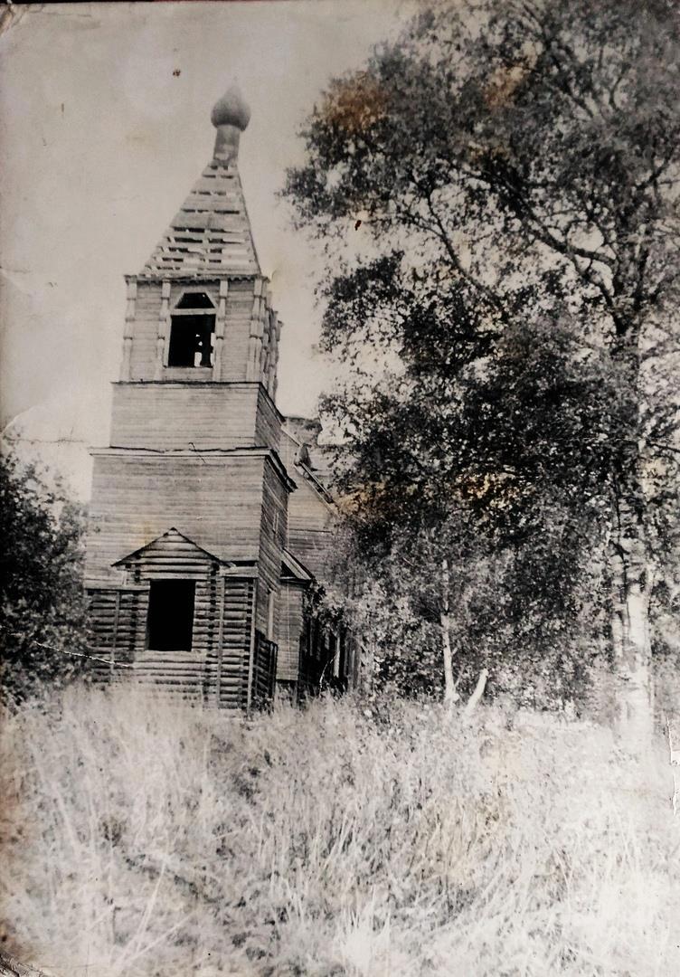 Вот так она выглядела - эту фотографию помогли найти в одной из Волховских групп вКонтакте только в 2019 году. Фото относится к 1980-м. Кстати, по фото можно предположить, что церковь очень схожа с таковой в Поддубье, вынесенной на обложку моей новой книги по церквям