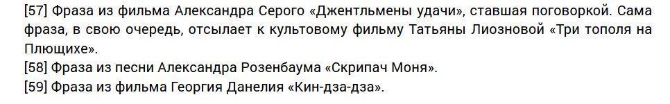 Зачем ему знать, что эта фраза из фильма Александра Серого, когда ему нужен контекст? Что даст читателю инфа о том, что Александр Данелия снял Киндзадзу, если единственной реакцией будет вопрос: «Кто все эти люди?»