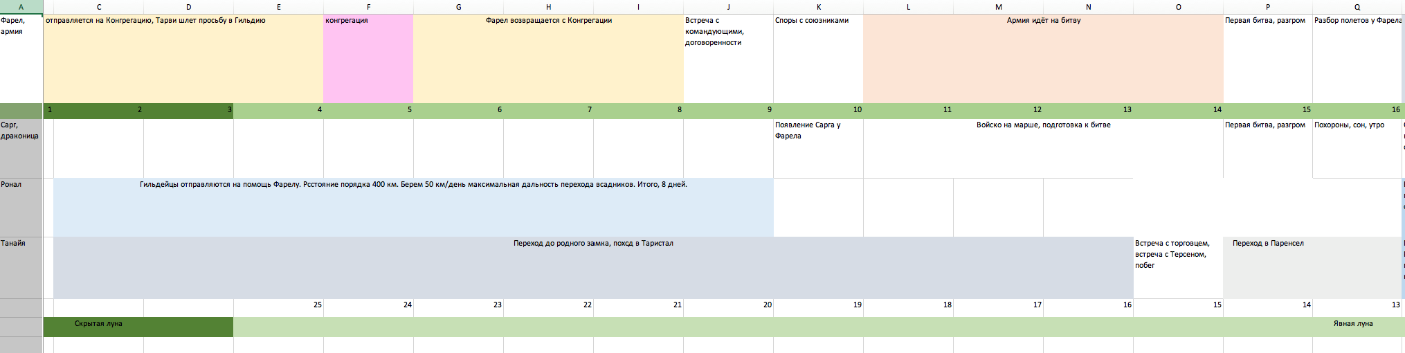Например, герои отправились в условное место. И добирались туда три дня. Три клетки в строке «Герои» закрашены событием «герои идут туда-то». На второй день, где-то в другой части страны некто решил, что ему тоже нужно в это же место. Но ему добираться туда четыре дня. Опа — мы избежали первой коллизии и родили небольшой сюжетный кусочек. Когда некто доберется до места, героев там или уже не будет, или они сделают, что хотят, или же будут в процессе. Закрашиваем четыре клетки в следующей строке путешествием некты и переходим к следующему событию.