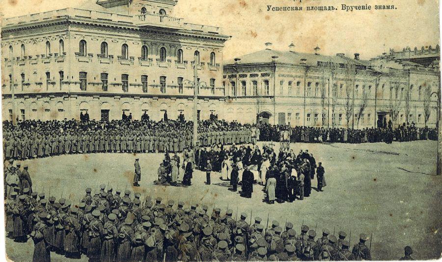 "Временно" получилось "навсегда" - революция, гражданская война и установление советской власти. Фото первомайского парада 1921 года на Успенской площади возле бывшего Дома Воронина вы тоже уже могли видеть в "Бритой" гимназии":