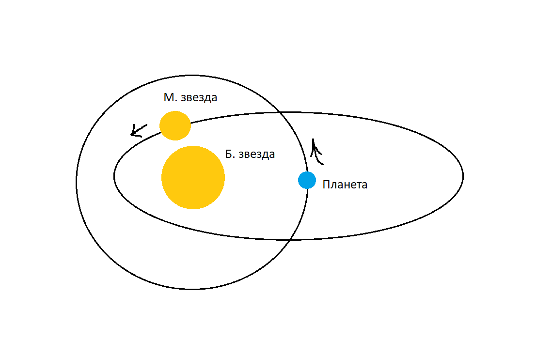 Или ещё вариант. Пусть планета вращается вокруг большой звезды, а маленькая звезда будет вращаться тоже вокруг большой, но "пересекать орбиту" нашей бедной планеты. Например, вот так: