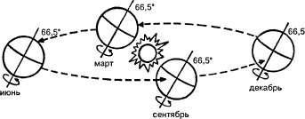Ближе к делу. Смена времён года происходит от того, что ось вращения Земли вокруг себя находится под углом к плоскости орбиты. Сложно? Тогда смотрите картинку: