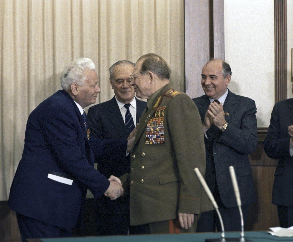 Министр обороны СССР Дмитрий Федорович Устинов вручает Генеральному секретарю ЦК КПСС Константину Устиновичу Черненко четвертый орден Ленина и третью золотую медаль "Серп и Молот". Москва, Кремль, сентябрь 1984 г. Фото Юрия Абрамочкина.