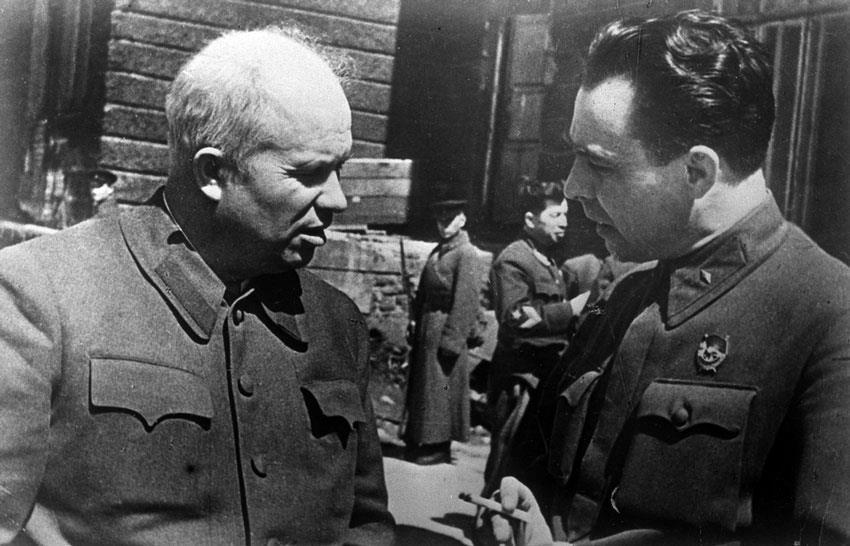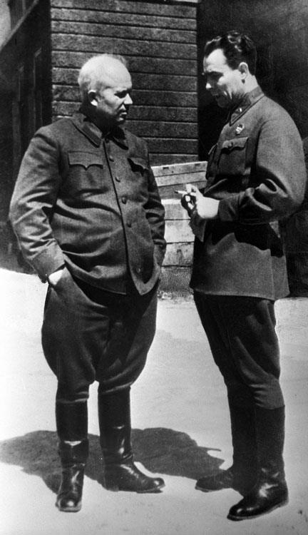Член Военного совета Юго-Западного фронта Н.С. Хрущев и начальник политотдела 18-й армии полковник Л.И. Брежнев за беседой. 1942 г.