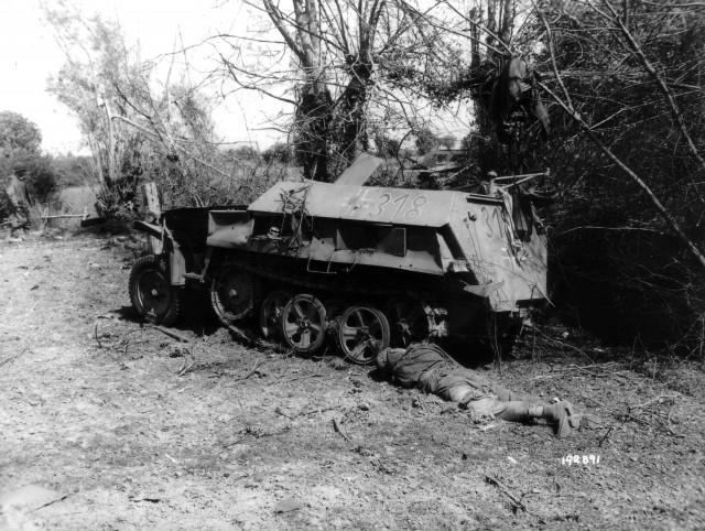 Подбитый бронетранспортер с убитым.