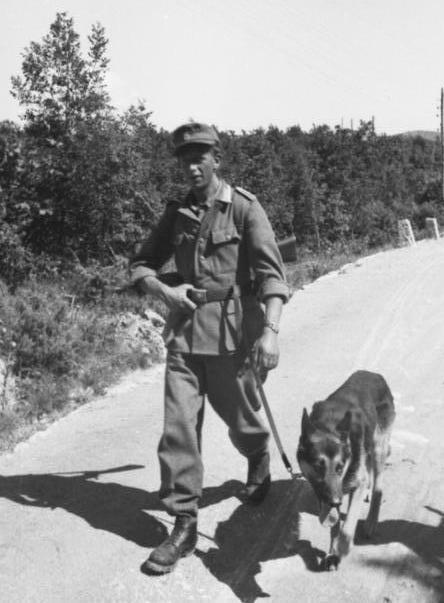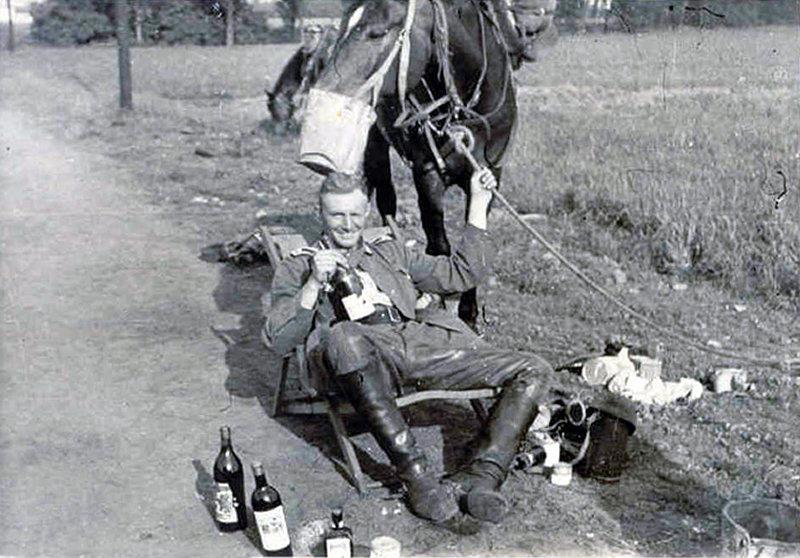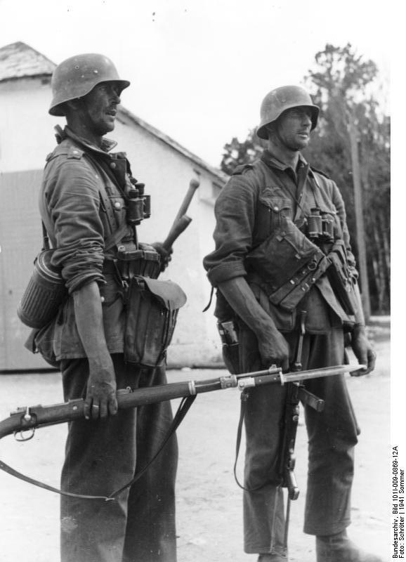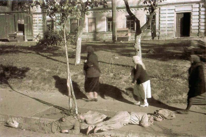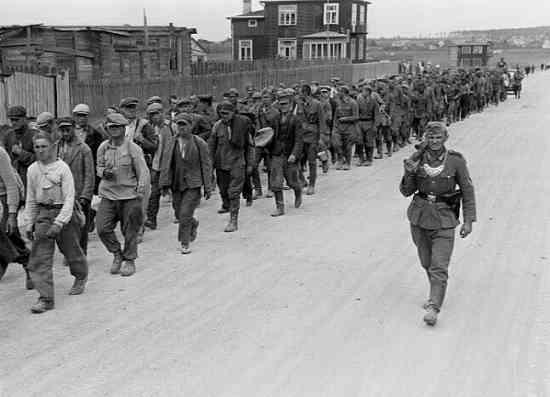 Фельджандарм конвоирует пленных. Обращает на себя внимание огромное количество гражданских - взятых гамузом по приказу, как "подозрительные лица".