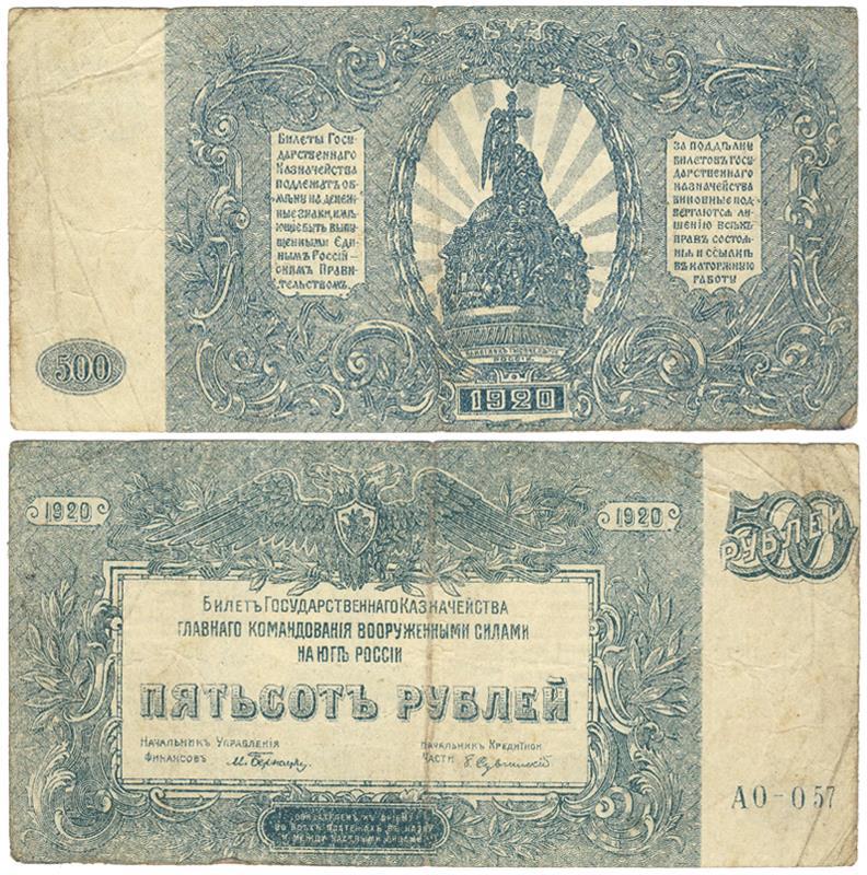 Купюра 500 рублей Государственного казначейства ГКВСЮР образца 1920 года