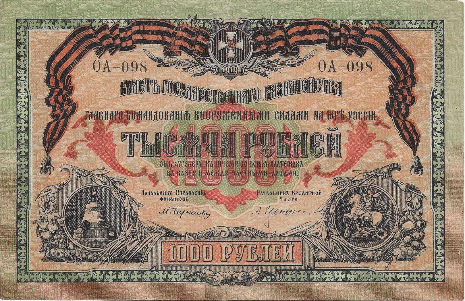 Купюра 1000 рублей Государственного казначейства ГКВСЮР