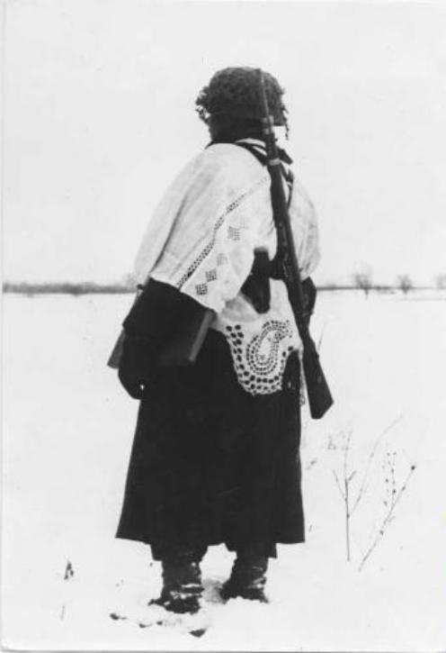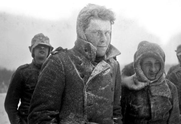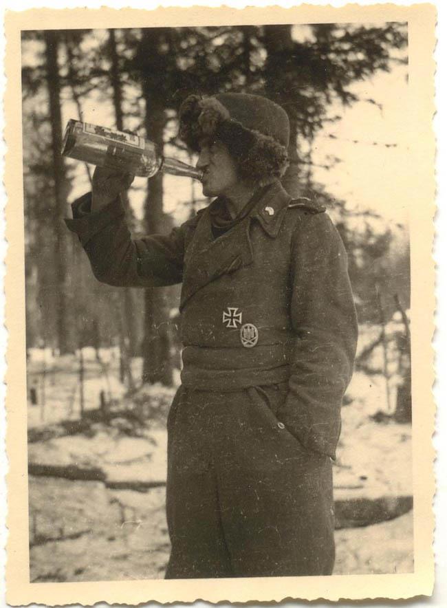 На фото ариец греется сразу двумя способами. Ушанка, к слову - гражданская. То есть отняли у местных.