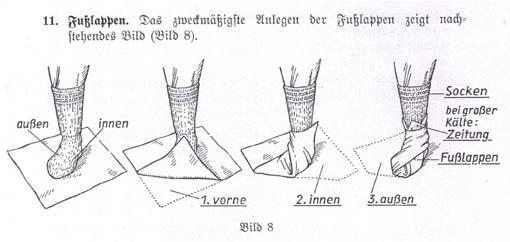Но помимо ватников, оказалось, что и дикарские портянки - увы - лучше носков по всем статьям. Понеся солидные потери отмороженными, вермахт ввел в оборот русские портянки.