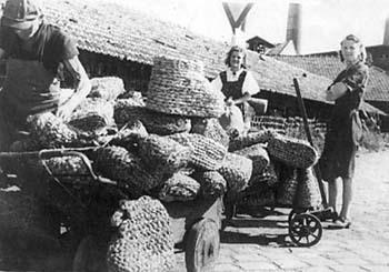 Новшества моды вермахта нашими гражданами были восприняты более чем прохладно. Бойцы кормят лошадей немецкими соломенно-сенными валенками