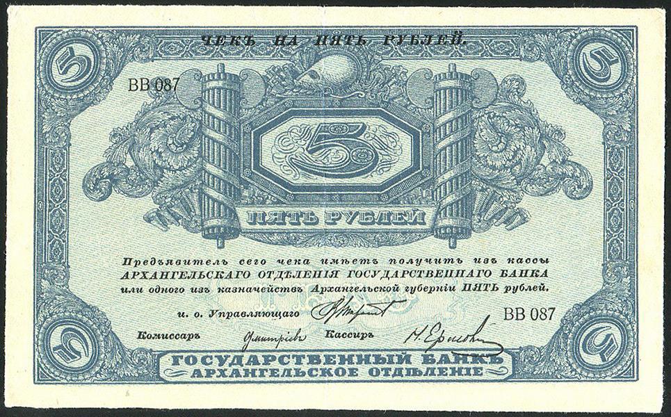Нелюбовь большевиков к отпечатанным, но не выпущенным в обращение чекам номиналом 5 рублей, унаследовало и белое правительство, особо предупредив, что хождения они по-прежнему иметь не будут. Кстати, по этой причине соответствующие купюры дошли до нас практически в идеальном состоянии: