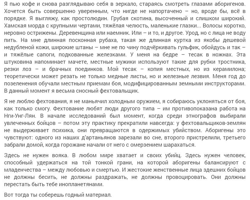 У меня сейчас четыре впроцессника. Два из них заморожены, а между «Дневниками» и «Принцем» я дрейфую по мере осознания этих историй и по мере слёзных молений читателей. Последний этап был — несколько глав «Принца», но увы, потерялась настройка на главного героя «Дневников», а значит, пришло время снова перечитать историю про землянина, который попал в «отсталое» общество, где «любовь», «честь», «совесть» — это не пустые слова!