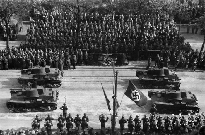 Версальский договор с его запретами и ограничениями не позволял Германии иметь ничего, кроме 100 тысяч пехотинцев. Такую "армию" разделала под орех даже бы армия Бельгии. У которой как раз была и артиллерия и бронетехника и авиация.
