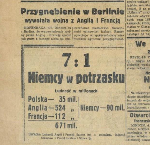 Пример из польской газеты первого дня войны. Разом нас богато - против всего лишь 90 млн. немцев аж 671 миллион союзников! И союзники уже объявляют войну Рейху!