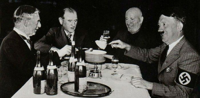 На фото Чемберлен, Даладье, Муссолини и Гитлер. Внезапно. Фондю кушают.