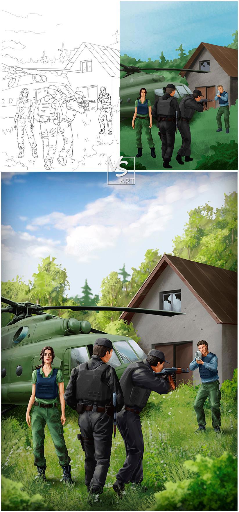 Автор: Салихов ВасильРабота получилась не быстрой и весьма сложной, но не только от долгого поиска нужного ракурса и большого количества персонажей и объектов. Подкосившая болезнь заставила работать в перерывах падения температуры и просветления разума.) Обложка для нового романа Андрея Степанова "Случайный солдат" и хронология ее создания вашему вниманию.