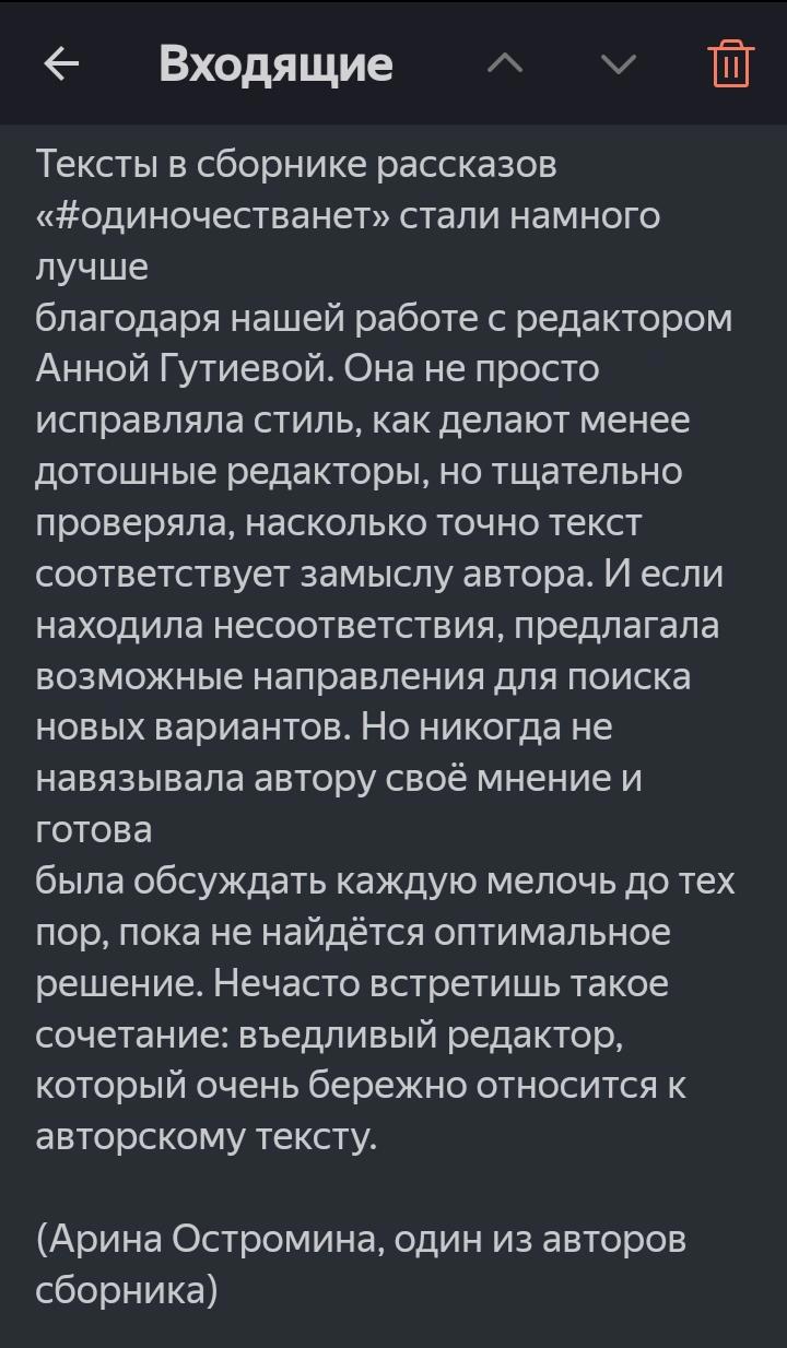 И еще, пока болтливое настроение, редактор – это не некая цензура или критик писателя. Под прошлым моим объявлением был коммент, который открыл глаза на то, откуда столько ненавистников именно моих объявлений о редактуре. Если кратко: то, что кто-то может глубоко покопаться в тексте и не просто исправить запятые, но влезть в структуру, помочь автору вытащить из самого себя незатронутые возможности, - это оказывается не плюс, а то, что вызывает раздражение. Как смеет редактор замахиваться на такое. Что ж, понимаю. Но и вы поймите, (далее по тексту образно - да, да, приходится делать приписку, а то мне на этом сайте так и чудятся в кустах злобные читатели блогов с дизлайками наперевес, надо ходить с оглядками и оговорками и не шуршать ветками) в моих глазах писатель – бог. Редактор – священник. Задача редактора – донести бога до прихожан. Бог делает чудеса. Священник совершает ритуалы. Понимаете разницу? Я понимаю, не я сверху в работе с авторами, я снизу, я – церковный служка. И уж так получилось, что я знаю свою работу и умею ювелирно работать как с текстами, так и с писательским самолюбием, потому что беспредельно уважаю эту способность складывать буквы в смыслы и создавать жизни, и моя задача вдохновить и дать надежду на будущее. На своей любимой пафосной ноте завершаю пост.
