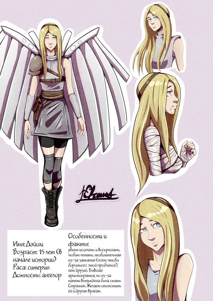 Персонаж №3. Девушка-ангелор – ещё один член организации, в бою является неким хилом, который подлатывает раненых и носит механические крылья. Героиня недавно поступает на службу и становится напарницей жнеца, занимая места своего погибшего учителя. Причем эта девушка эдакая невинная душа, сама доброта и тд. Её сила – противоположна силе жнеца. Немудрено, что напарник начинает исподтишка питать к ней тёплые чувства, а та в свою очередь сторонится его.