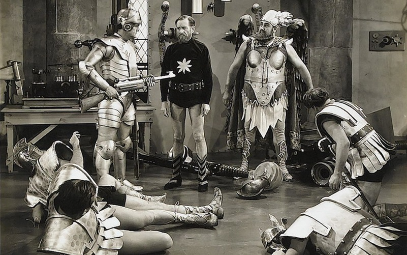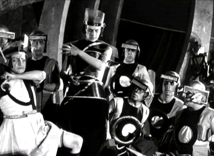 Этот фильм явный тяжеловес в плане костюмов и декораций. Надо отметить что над этим хорошо потрудился художник-абстракционист Ласло Мохой-Надь. Декорации действительно поражают воображение своей эпичностью, масштабом, футуристичностью. Но похоже художник так увлекся декорациями что не особо задумывался над костюмами героев. Хотя здесь тоже видна некоторая творческая работа. Ему удалось немыслимое - объединить два типа одежды: древнеримскую тунику, японскую накидку самураев хаори и европейские шорты. В некоторых вариациях используется вместо туники тога. Интересное и весьма необычное получилось сочетание. Иногда мужики напоминают собой парусник идущий на всех парусах. Весьма полезная вещь когда переберешь со спиртным, а на улице ветер дует в сторону родного дома. Вышел из бара подпрыгнул, и оп-ля уже стекаешь со своей входной двери. Главное правильный азимут выбрать.